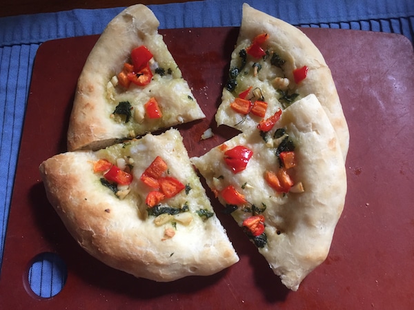 After all the baking and partying (such as it was) of the new year, time for something a bit different. My fellow foodies theme this month is “Veganuary,” meaning vegetarian dishes with no eggs or dairy products. I’ve been wanting to make this garlic bruschetta pizza for a while anyway, and it happens to fit the theme too.