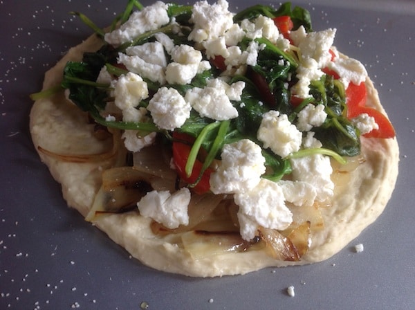 Mellowed sweet onions, slow-cooked onions, earthy goat cheese, leafy spinach, and crispy bell pepper are a fresh change from the usual cheese and tomato.